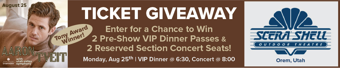Tony Award-winning, Broadway, television, and film actor, Aaron Tveit, is joined by the Utah Valley Symphony for this sold-out concert on Monday, August 25th at 8:00 p.m. at the SCERA Shell Outdoor Theatre in Orem.